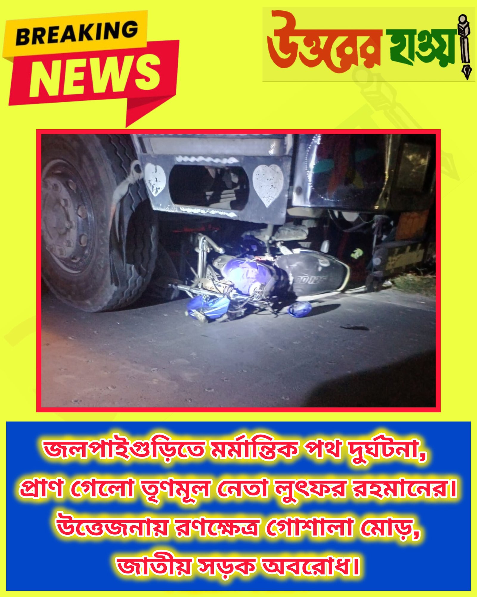 জলপাইগুড়িতে মর্মান্তিক পথ দুর্ঘটনা, প্রাণ গেলো তৃণমূল নেতা লুৎফর রহমানের। উত্তেজনায় রণক্ষেত্র গোশালা মোড়, জাতীয় সড়ক অবরোধ।
