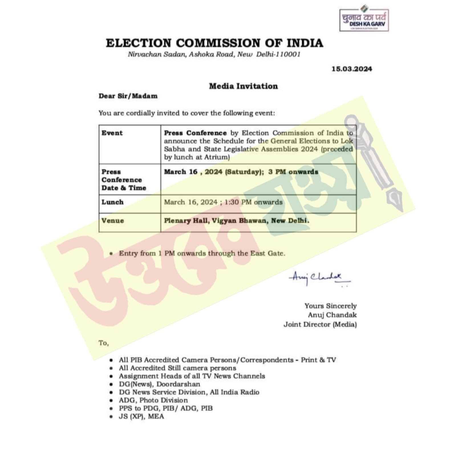 উত্তরের হাওয়া, ১৫ মার্চ: জল্পনার অবসান। আগামীকাল শনিবার লোকসভা ভোটের নির্ঘণ্ট ঘোষণা করবে জাতীয় নির্বাচন কমিশন। আজ শুক্রবার কমিশনের তরফে এই খবর জানানো হয়েছে। জাতীয় নির্বাচন কমিশনে নির্বাচন কমিশনারের দুটি পদ শূন্য ছিল। গতকাল নতুন কমিশনার নিয়োগের প্রক্রিয়া সম্পন্ন হয়েছে। তার পরই আজ ভোট ঘোষণার সিদ্ধান্ত নিয়ে কমিশন। আগামীকাল শনিবার বিকেল ৩টার সময় নতুনদিল্লির নির্বাচন কমিশনের সদনে সাংবাদিক বৈঠক করে ভোটের নির্ঘণ্ট ঘোষণা করা হবে।