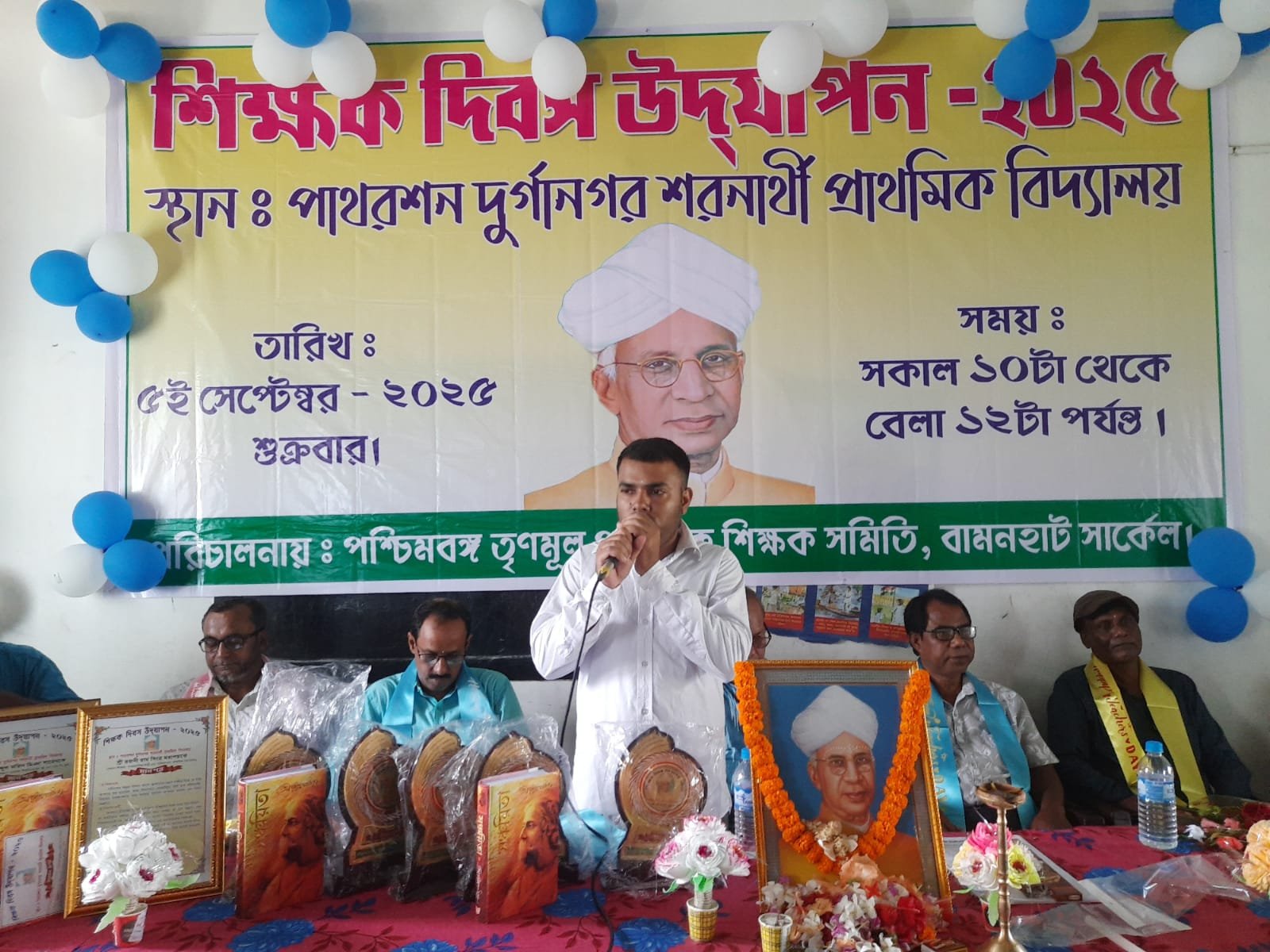 উত্তরের হাওয়া, ৫ সেপ্টেম্বর: পাথশন দুর্গানগর আর আর প্রথমিক বিদ্যালয়ে বামনহাট চক্র সম্পদ কেন্দ্রের উদ্যোগে শিক্ষক দিবস উদযাপন করা হয়েছে। এ উপলক্ষে এবছরের অবসরপ্রাপ্ত ৫ জন শিক্ষকের কৃতিত্বকে স্বীকৃতি জানিয়ে সম্মাননা প্রদান করা হয়। অনুষ্ঠানটি পশ্চিমবঙ্গ তৃণমূল প্রথমিক শিক্ষক সমিতির আয়োজনে সম্পন্ন হয়। চক্রের সভাপতি হানিফ সিকদার বলেন, “শিক্ষকরা সমাজের গঠনমূলক স্তম্ভ। তাদের অবদান স্বীকৃতির যোগ্য। তাই শিক্ষক দিবসে তাদের সম্মাননা প্রদানের মাধ্যমে আমরা কৃতজ্ঞতা প্রকাশ করেছি।” উদ্বোধনী অনুষ্ঠানে ডঃ সর্বপল্লি রাধাকৃষ্ণানের জীবনের সংগ্রাম ও শিক্ষাক্ষেত্রে অবদানের ওপর আলোকপাত করা হয়। এরপর শিক্ষকরা ছাত্র-ছাত্রীদের সঙ্গে সময় কাটান এবং শিক্ষার্থীরা বিভিন্ন সাংস্কৃতিক অনুষ্ঠান করে তাদের প্রতি সম্মান জানায়। অনুষ্ঠানে চক্র সম্পদ কেন্দ্রের শিক্ষকবৃন্দ এবং শিশু শিক্ষার্থীরা উপস্থিত ছিলেন। শিক্ষকরা শিক্ষার্থীদের সঙ্গে অভিজ্ঞতা ভাগাভাগি করেন এবং শিক্ষার গুরুত্ব বোঝান। শিক্ষক দিবস উদযাপন শিক্ষকদের প্রেরণা বৃদ্ধি করেছে এবং শিক্ষার্থী-শিক্ষকের মধ্যে বন্ধুত্ব ও প্রেরণার সম্পর্ক আরও দৃঢ় করেছে। অংশগ্রহণকারীরা এই ধরনের উদ্যোগকে প্রশংসা করেছেন এবং ভবিষ্যতেও এমন অনুষ্ঠান চালিয়ে যাওয়ার আহ্বান জানিয়েছেন।