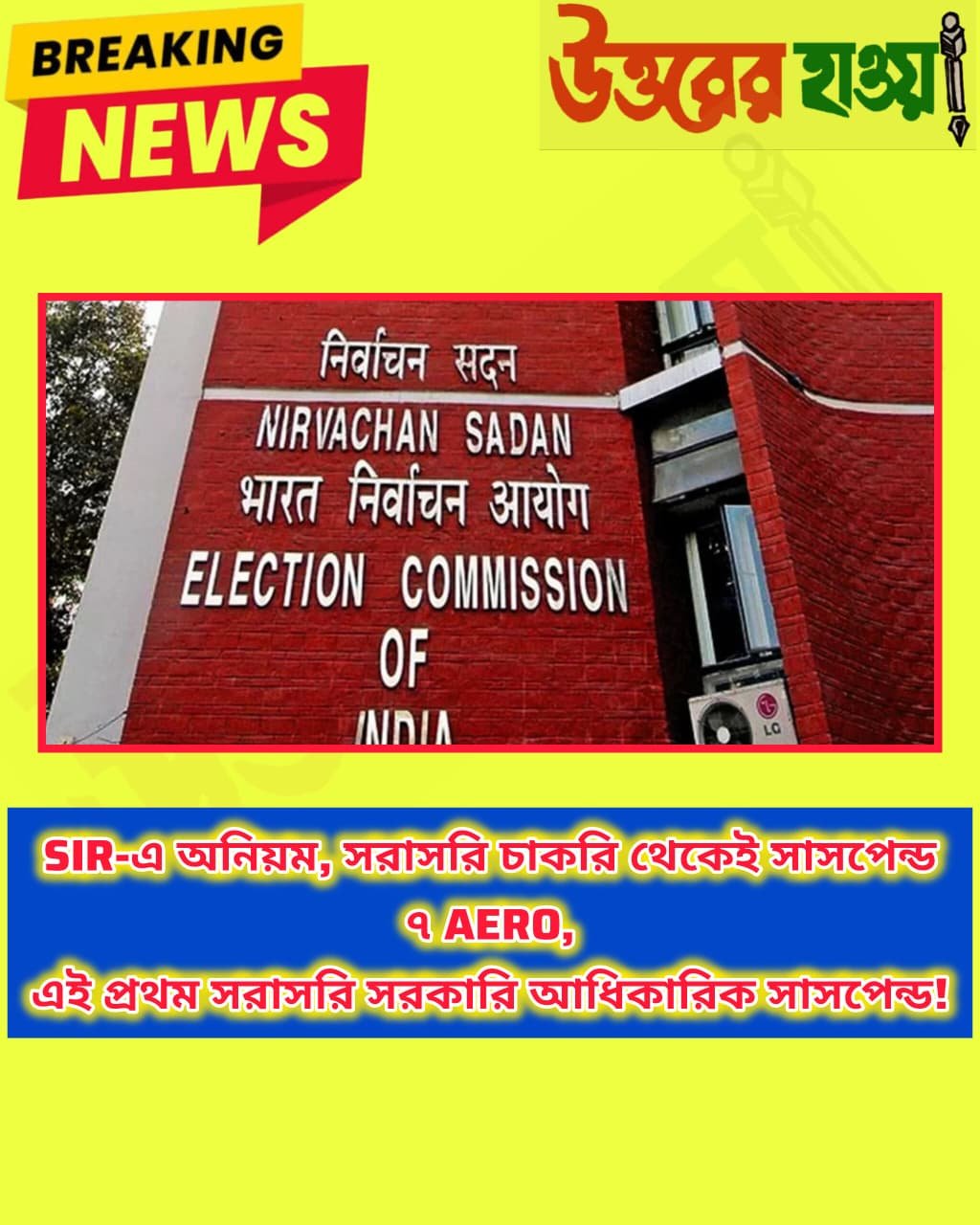 Monday : উত্তরের হাওয়া, ১৬ ফেব্রুয়ারিঃ ভোটার তালিকার বিশেষ সংশোধন প্রক্রিয়া (SIR) ঘিরে অনিয়মের অভিযোগে ৭ জন অ্যাসিস্ট্যান্ট ইলেক্টোরাল রেজিস্ট্রেশন অফিসার (AERO)-কে সাসপেন্ড করল জাতীয় নির্বাচন কমিশন। ১৩টি রাজ্যে SIR চললেও এই প্রথম সরাসরি সরকারি আধিকারিকদের বিরুদ্ধে এমন কঠোর পদক্ষেপ নেওয়া হল। দক্ষিণ ২৪ পরগনা, মুর্শিদাবাদ, জলপাইগুড়ি ও পশ্চিম মেদিনীপুর—এই চার জেলার ক্যানিং পূর্ব, ময়নাগুড়ি, ডেবরা, সামশেরগঞ্জ, ফারাক্কা ও সুতি বিধানসভা এলাকার সঙ্গে যুক্ত ৭ আধিকারিকের বিরুদ্ধে কর্তব্যে গাফিলতি ও নথি যাচাইয়ে ক্ষমতার অপব্যবহারের অভিযোগ উঠেছে। অভিযোগ, প্রয়োজনীয় নথি খতিয়ে না দেখে ভোটার তালিকায় নাম অন্তর্ভুক্তির মতো গুরুতর অনিয়ম হয়েছে। SIR-এর শুনানি শেষ হতেই কমিশন ডিসিপ্লিনারি অ্যাকশনের নির্দেশ দেয়। জাতীয় নির্বাচন কমিশনের সচিব সুজিত কুমার মিশ্র মুখ্যসচিবকে চিঠি দিয়ে অবিলম্বে বিভাগীয় ব্যবস্থা নেওয়ার নির্দেশ দিয়েছেন। পাশাপাশি আরও ৭ আধিকারিককে SIR-এর কাজ থেকে সরানো হয়েছে। রাজ্য সরকার ব্যবস্থা না নেওয়ায় কমিশনের এই পদক্ষেপকে বেনজির বলেই মনে করছে রাজনৈতিক মহল।