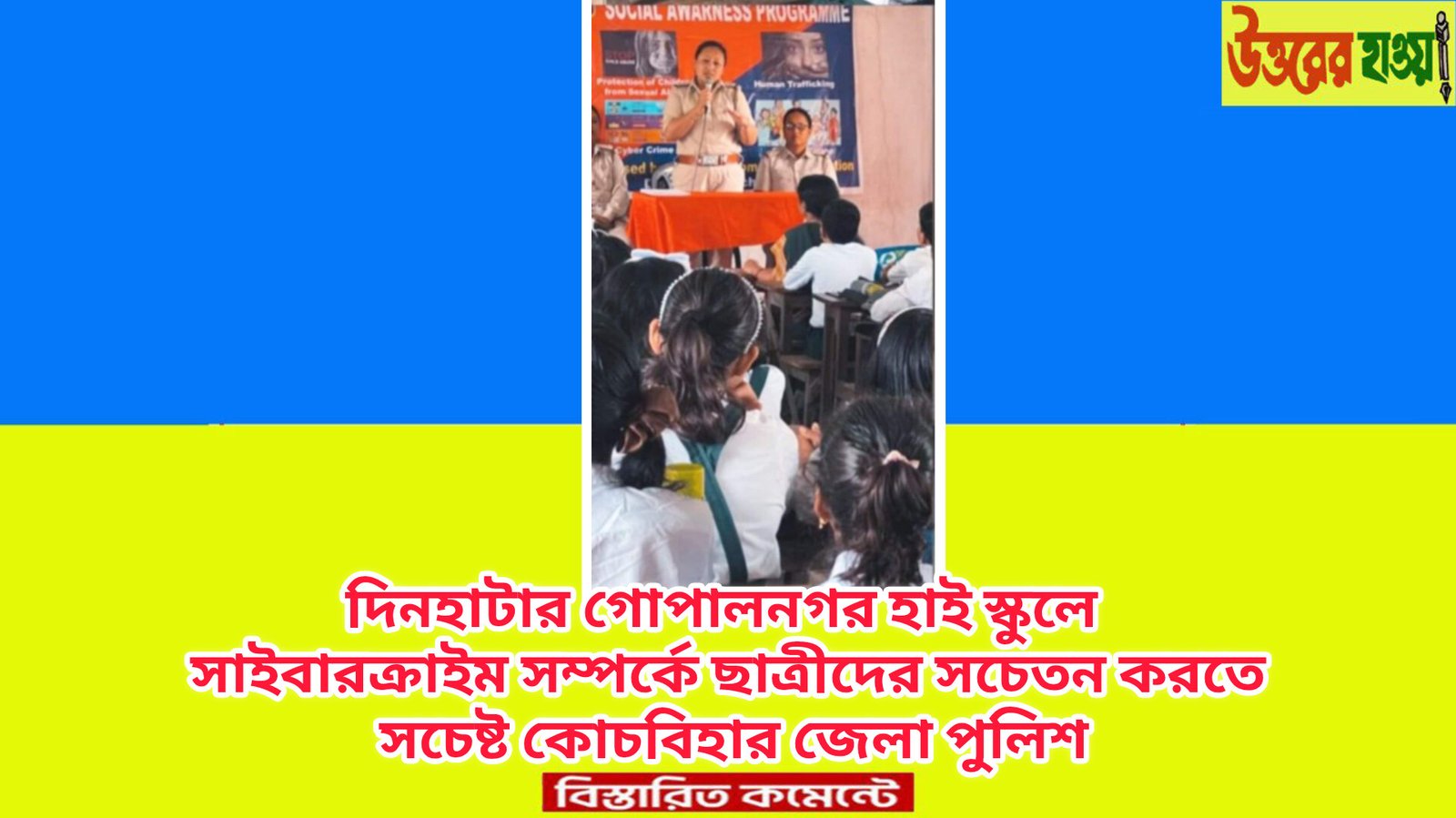 উত্তরের হাওয়া, দিনহাটা, ৩০ মার্চ: স্কুলপড়ুয়া কিশোরীদের সাইবারক্রাইম সম্পর্কে সচেতন করতে উদ্যোগ নিল পুলিশ। শনিবার কোচবিহার জেলার দিনহাটা মহিলা থানার উদ্যোগে একটি সচেতনতা শিবির হয়। স্হানীয় গোপালনগর হাইস্কুলে আয়োজিত এই শিবিরে পুলিশ আধিকারিক ও সাইবার ক্রাইম বিশেষজ্ঞরা উপস্হিত ছিলেন। মুলত ছাত্রীদের বিরুদ্ধে অপরাধ, বাল্য বিবাহ, মানব পাচার এবং সাইবার জগতের অপরাধ নিয়ে আলোচনা করা হয় ও সচেতনতা প্রচার করা হয়। মহিলা থানার এক আধিকারিক জানান, সময়ের সাথে ইন্টারনেটের জনপ্রিয়তার সাথে সাথেই বেড়েছে জনসাধারনের বিরুদ্ধে সাইবার অপরাধের ঘটনাও। তাই সাধারণ মানুষের ও ছাত্রছাত্রীদের অনলাইন প্রতারণার বিষয়ে কোচবিহার জেলা পুলিশের বিভিন্ন থানা এই মানব পাচার বিরোধী এবং ছাত্রীদের গুড টাচ ও ব্যাড টাচ সম্পর্কিত কর্মসূচি চলতে থাকবে।