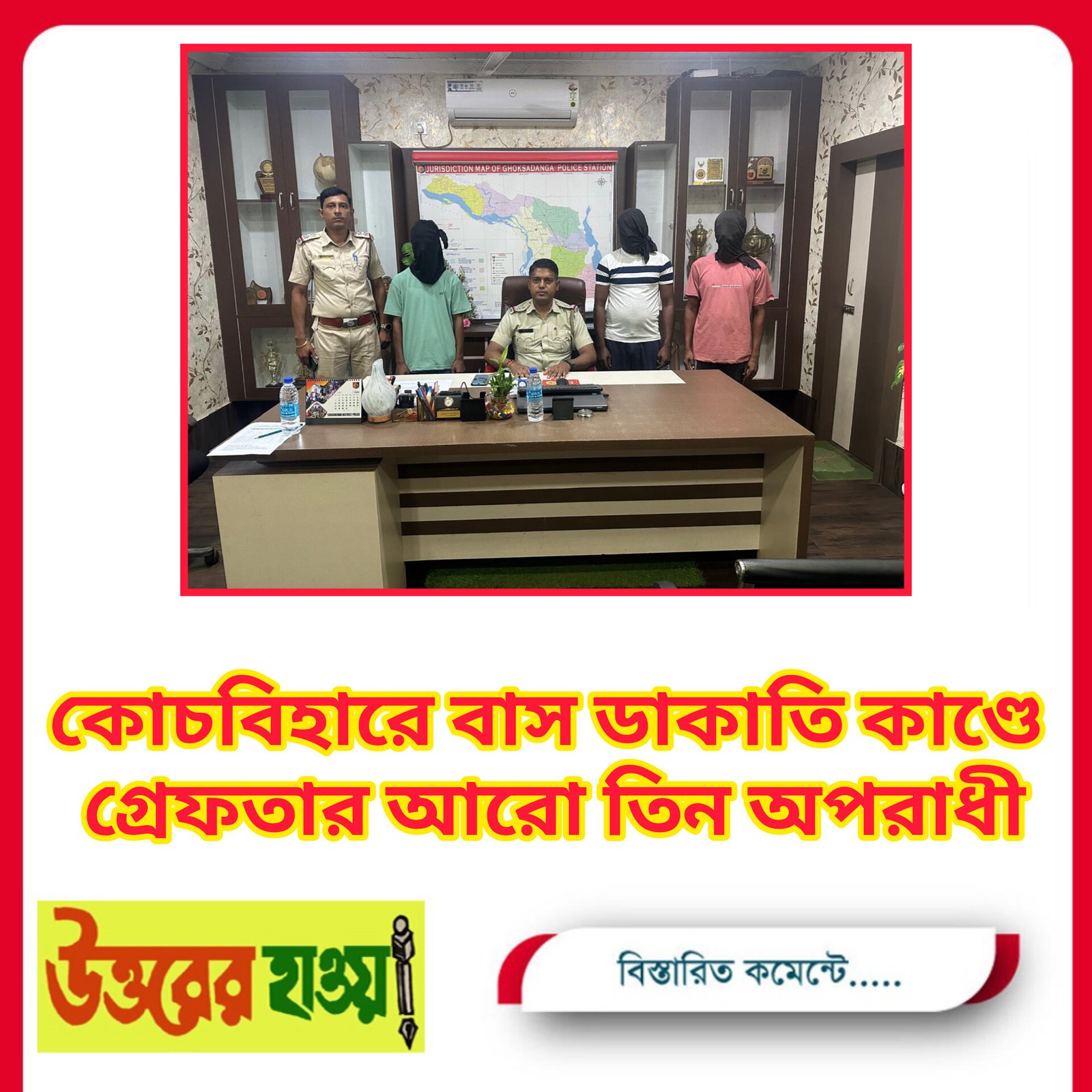 উত্তরের হাওয়া, ১০জুলাই: প্রকাশ্যে বাস ডাকাতির ঘটনার পর দ্রুততার সঙ্গে তৎপর হয়েছিল কোচবিহার জেলা পুলিশ প্রশাসন এবং ঘোকসারডাঙ্গা থানা। 24 ঘন্টার মধ্যে প্রথম দুই অপরাধীকে গ্রেপ্তার করতে সমর্থক হয়েছিল পুলিশ। এদিন এই ঘটনায় জড়িত আরও তিনজনকে গ্রেফতার করে ঘোকসারডাঙ্গা থানার পুলিশ। তাদের পুলিশে হেফাজতের জন্য আদালতে পাঠানো হয়েছে। কোচবিহার জেলা পুলিশ সুপার দ্যুতিমান ভট্টাচার্য এদিন এক সাংবাদিক বিবৃতিতে জানান, বাস ডাকাতির ঘটনায় আজিনুর ইসলাম, মজিদুল হক এবং সিরাজুল মিয়াকে গ্রেফতার করা হয়েছে। এরা সকলেই কোচবিহার উত্তর বিধানসভা কেন্দ্রের অন্তর্গত কারিশাল, টাকা গাছ এলাকার বাসিন্দা। গোপন সূত্রে খবর পেয়ে এবং বিগত দিনের গ্রেফতার হওয়া ব্যক্তিদের জেরা করে এদেরকে গ্রেফতার করা হয়েছে। এদেরকে পুলিশ হেফাজতের জন্য আদালতে পাঠানো হয়েছে। প্রসঙ্গত, গত 1 তারিখ কোচবিহার হোকসারডাঙ্গা থানা এলাকার প্রধান সড়কের ওপর একটি বেসরকারি বাসে প্রকাশ্য দিবালোকে ডাকাতের ঘটনা ঘটে। তারপরেই দ্রুততার সঙ্গে তদন্ত শুরু করে পুলিশ। ঘটনার ২৪ ঘন্টার মধ্যে মোহাম্মদ শাহের নামক এক ব্যক্তিকে আটক করতে সামর্থ্য হয় পুলিশ। তাকে তিন দিনের হেফাজতে নিয়ে জেরা করা শুরু হয়। এবং সেখান থেকেই বাকিদের সন্ধান পাওয়া গেছে বলে পুলিশ সূত্রে জানানো হয়েছে।